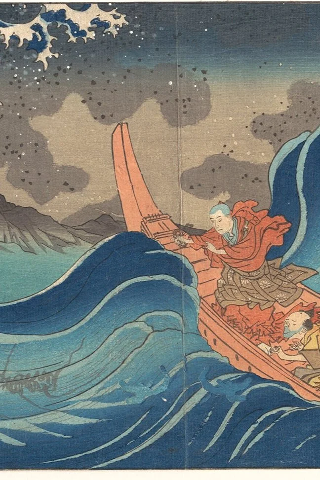 As he calms the salty, wild sea the monk Nichiren is iconic. The life of Nichiren, the founder of the sect of Buddhism that bears his name, has inspired legions of his followers to the present day. This print depicts the iconic scene of a the sect's main devotion, the invocation "Praise to the Sutra of the Lotus Blossom of the Fine Dharma" in the ocean waves as Nichiren travels to exile on the island of Sado in 1272.