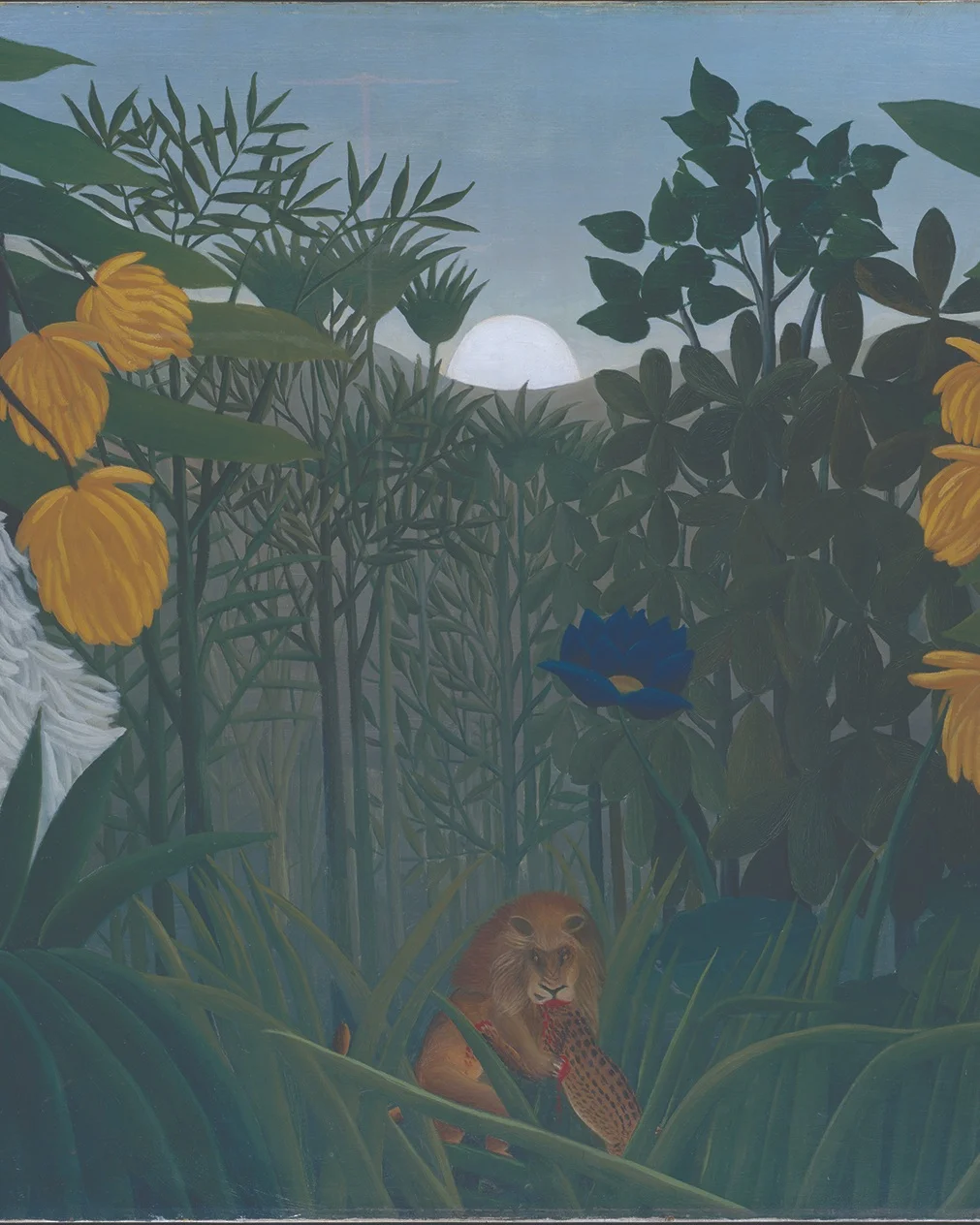 One in his well known series of jungle scenes, this painting shows an idyllic, lush & exotic landscape with a lion, caught in a stare with the viewer; vaguely stunned. Rouseau took inspiration from his time studying Paris’s botanical gardens while adapted the wild beasts from illustrated children's books.